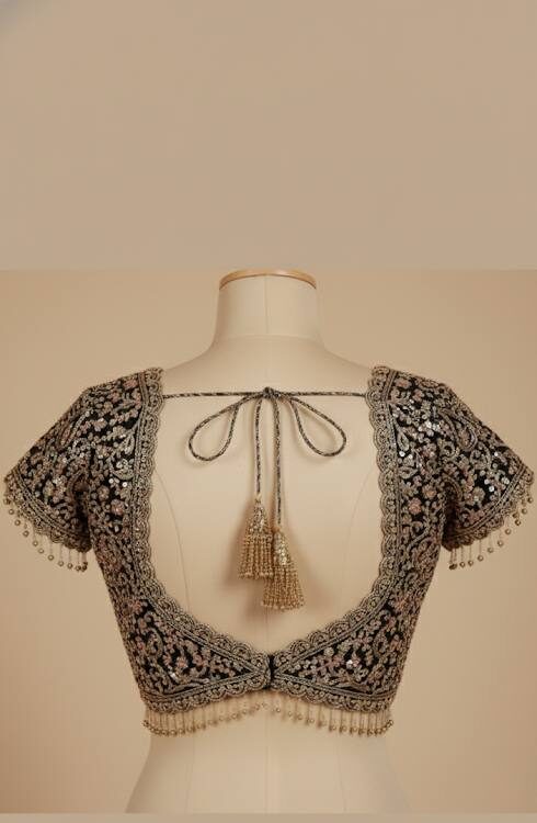 This elegant black blouse features dense all-over zari and sequin embroidery in a rich, paisley-inspired pattern. The deep V-neckline is highlighted with a scalloped embroidered border, giving it a refined, festive appeal. The short sleeves are adorned with matching embroidery and finished with delicate hanging bead tassels that add graceful movement. The hemline mirrors the same intricate detailing, making the blouse a versatile pick for pairing with lehengas, sarees, or festive skirts.