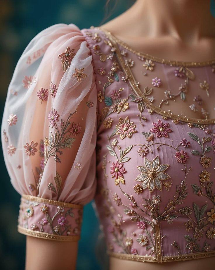 A mesmerizing pastel pink blouse, intricately embroidered with blooming 3D floral motifs and beads. The sheer puff sleeves and dainty cuffs add a fairy-tale charm, making it ideal for whimsical occasions.