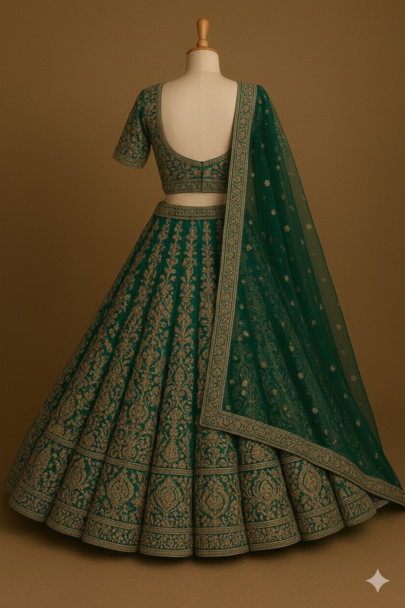 Step into regal elegance with this emerald green lehenga set, exquisitely crafted in silk and adorned with intricate gold zari embroidery. The voluminous skirt features elegant foliage and paisley motifs, enhanced by a grand embroidered border that brings timeless sophistication to every movement. Paired with a matching blouse, styled with a flattering neckline and coordinated embroidery, the ensemble is completed by a sheer green dupatta—the perfect finishing touch with its delicate pattern and ornate border. Ideal for weddings, festive celebrations, and formal receptions, this set stands out for brides and fashion lovers who appreciate meticulous handwork and rich colors.