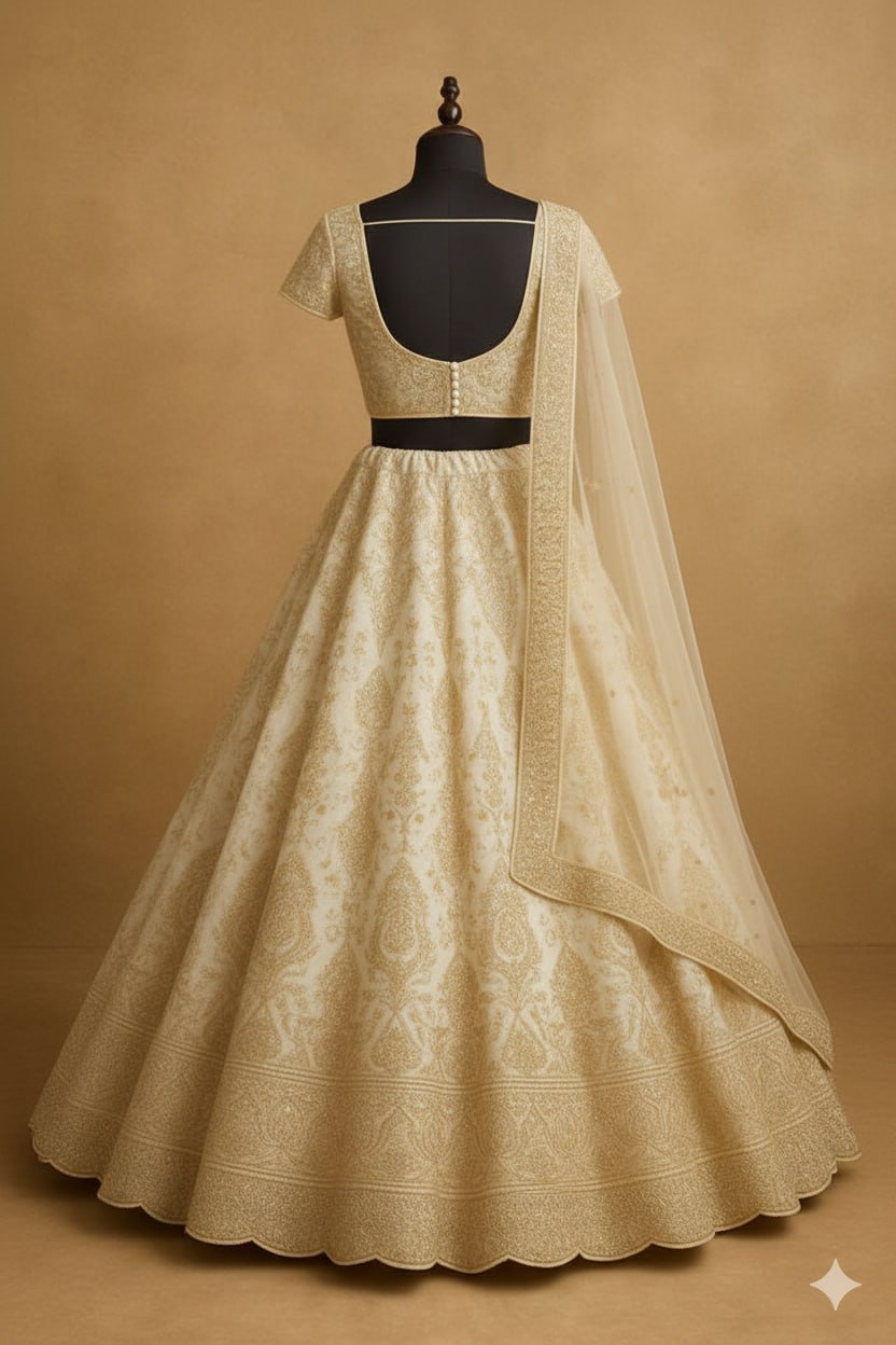 Radiate sophistication and timeless grace in this ivory lehenga set, exquisitely crafted from premium organza and richly detailed with intricate gold embroidery. The full-flared skirt showcases lavish motifs and scalloped borders, adding depth and regal charm to every twirl. The matching blouse, featuring a deep back and elegant short sleeves, is tailored for a flattering fit, while the lightweight organza dupatta completes the look with fine embroidery and a lustrous finish. Perfect for brides, receptions, and upscale occasions, this ivory ensemble delivers understated luxury and ethereal beauty with every step.​
