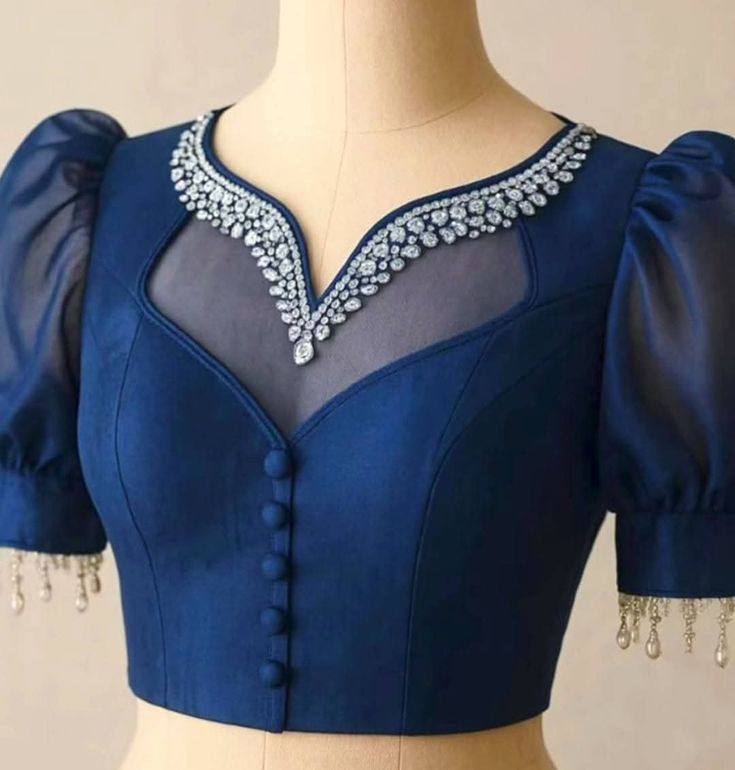 This sophisticated navy blouse features a uniquely cut sheer yoke adorned with sparkling stonework and a statement neckline. The puff organza sleeves and delicate button detailing perfectly balance edgy glamour and refined tradition.