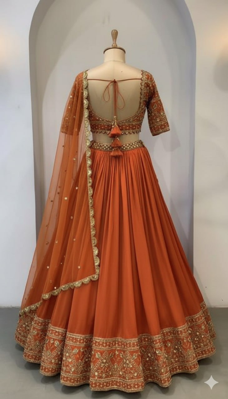 Radiate festive warmth and contemporary grace in this rust orange silk lehenga set, thoughtfully designed with a voluminous pleated skirt in rich, lustrous silk. The matching blouse, cut in a chic square neckline and elegant half sleeves, dazzles with intricate golden embroidery and sequin embellishments across the front and sleeves. Completing the ensemble is a sheer orange dupatta, adorned with delicate golden butti work and finished with a scalloped embroidered border for a luxurious touch. This elegant set is perfect for weddings, sangeet celebrations, and festive events—blending tradition with a modern color palette for a look that truly stands out.